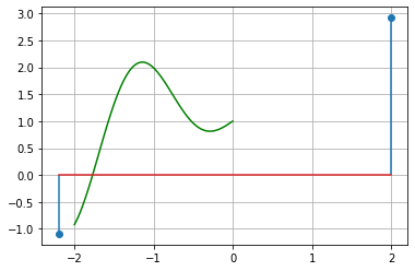 plt.stem([a, b], [fa, fb], use_line_collection = True)