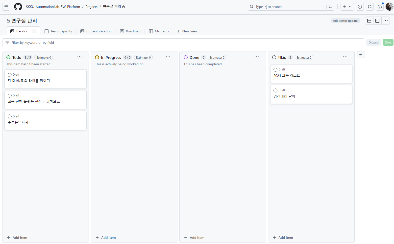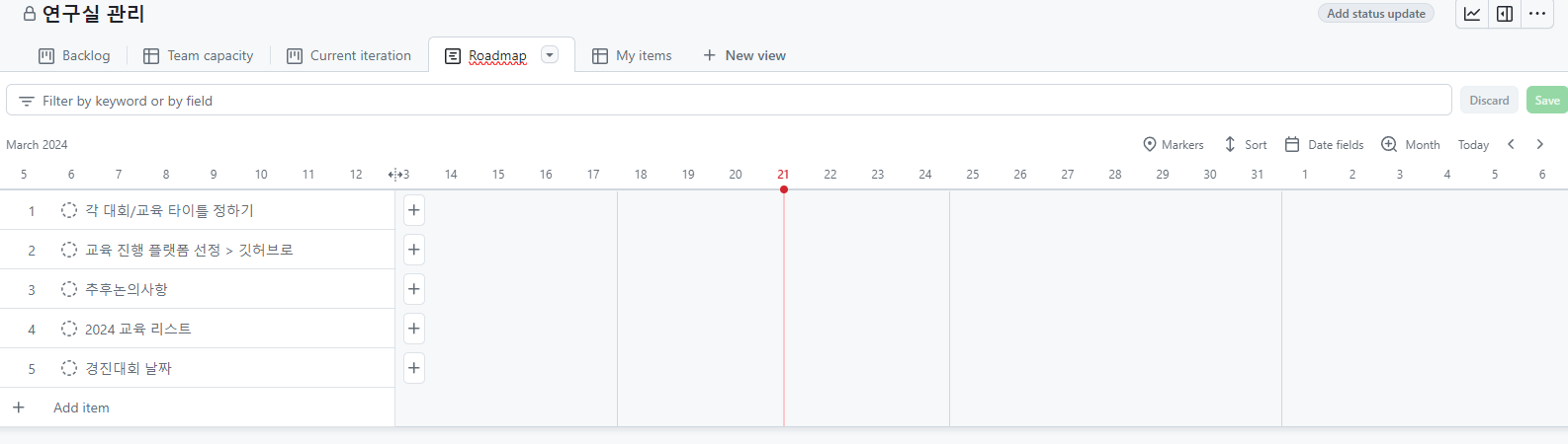 해당 탭에서는 프로젝트 일정 관리를 할 수 있도록 세팅해 뒀습니다