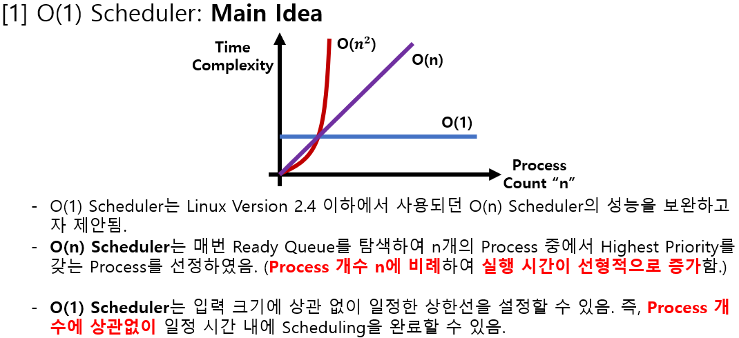 > 그러나 이는 테스크의 갯수가 늘어나면 스케줄링에 걸리는 시간도 증가하고(시간복잡도), 스케줄링에 소모되는 시간도 예측할 수 없다(이게 리눅스 커널 버전 2.4의 스케줄러)