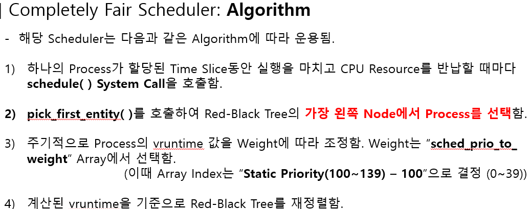 3. 모든 테스크는 vruntime값을 키고 RBtree에 정렬되어 있으며, 가장 작은 vruntime값을 갖는 테스크가 다음 수행 대상으로 선정된다